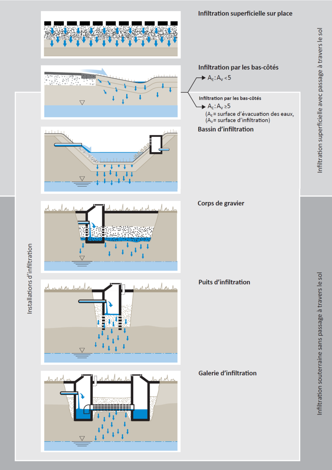 Une installation d’infiltration est un ouvrage superficiel ou souterrain édifié en vue de l’infiltration artificielle des eaux de ruissellement. On considère aussi sciemment comme installations d’infiltration des surfaces de sol réservées pour l’infiltration dans lesquelles on s’accommode d’un enrichissement à long terme en substances nocives. C’est habituellement le cas lorsque le rapport entre surface d’évacuation des eaux et surface d’infiltration (AE/AV) est ≥5.
