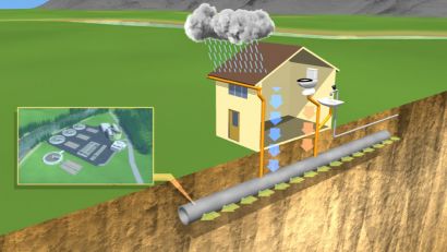 L’ensemble des eaux usées et pluviales est, en système unitaire, évacué par un réseau unique, généralement équipé de déversoirs d’orage, vannages, etc. permettant, en cas de pluies intenses, le rejet par surverse d’une partie des eaux, dirigées par un évacuateur vers le milieu naturel soit directement soit après traitement spécifique (selon M. Satin, B. Selmi, Guide technique de l’assainissement).