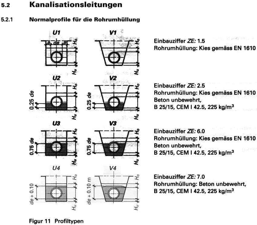 Art und Weise der unmittelbaren Rohrumgebung im Boden: Bettungsschicht (Unterlage der Leitung), Verdämmung (seitliche Auffüllung), Schutzschicht