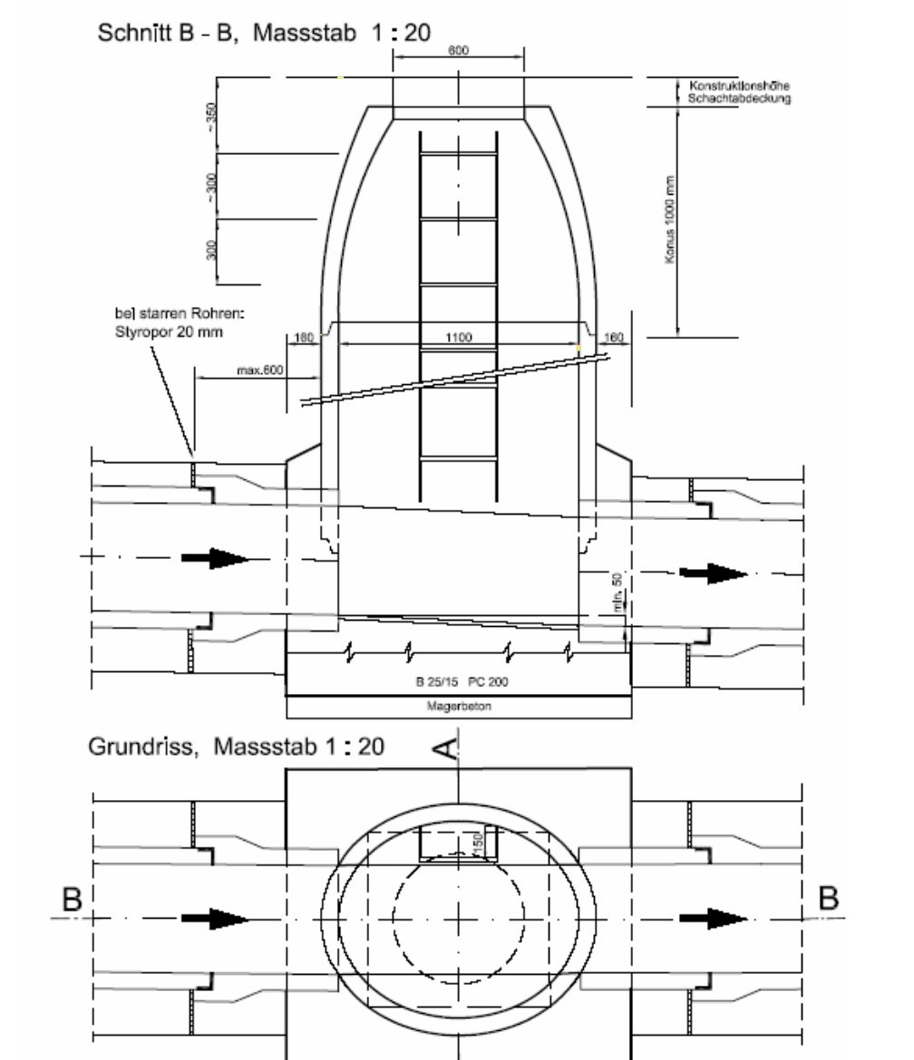 Normiertes Schachtbauwerk mit abnehmbarem Deckel im Kanalnetz.